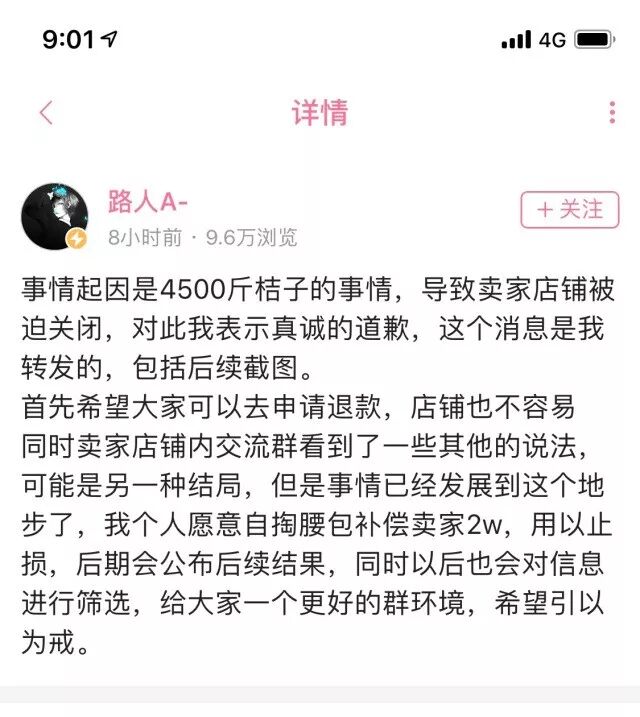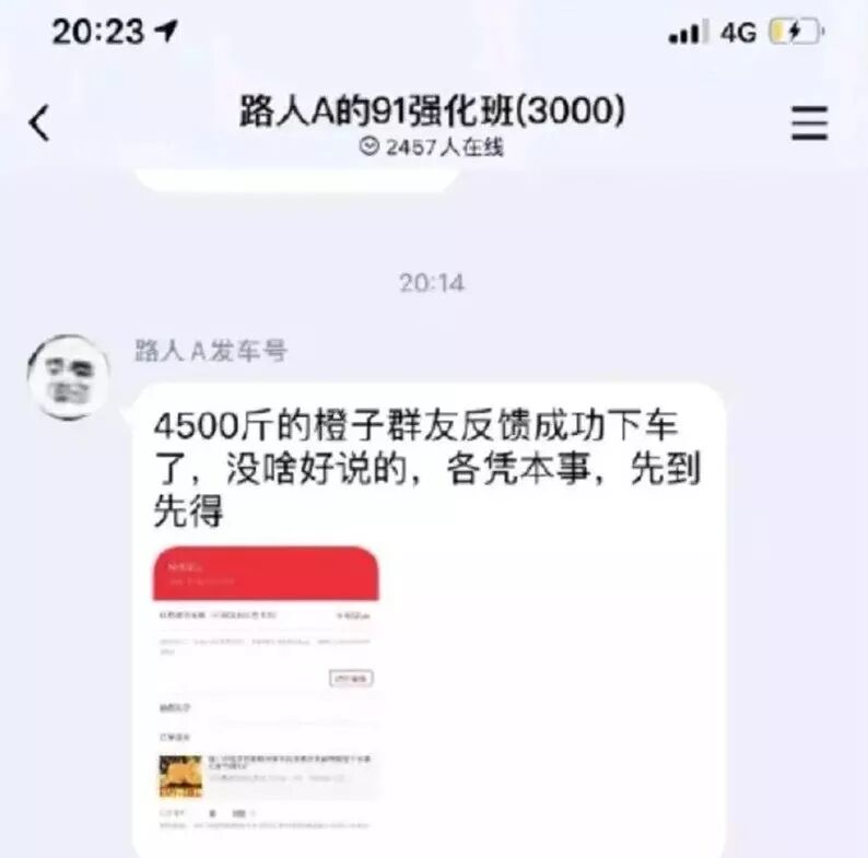 因為店主設(shè)置錯了規(guī)格(將4500克的橙子設(shè)置成了4500斤),路人A-發(fā)現(xiàn)了這個bug便在群里號召粉絲去店鋪薅羊毛。