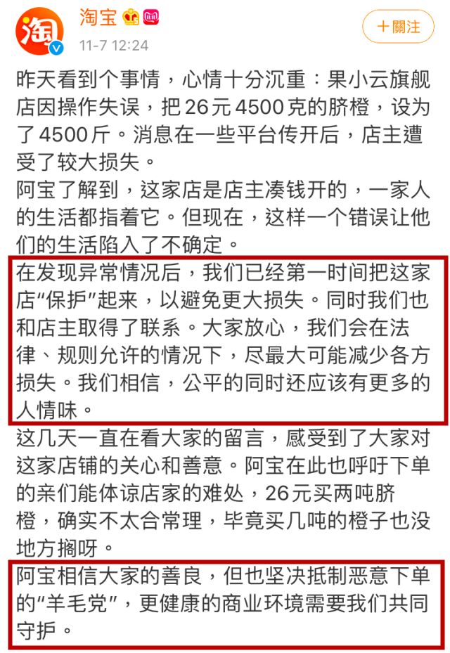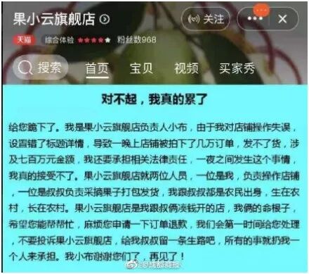 分析這次事件本身,從參與者的角度,賣家(果小云旗艦店)、電商平臺(天貓)、社交平臺(B站)、買家(以路人A-為核心的羊毛黨)四者皆有不可忽略的責任。